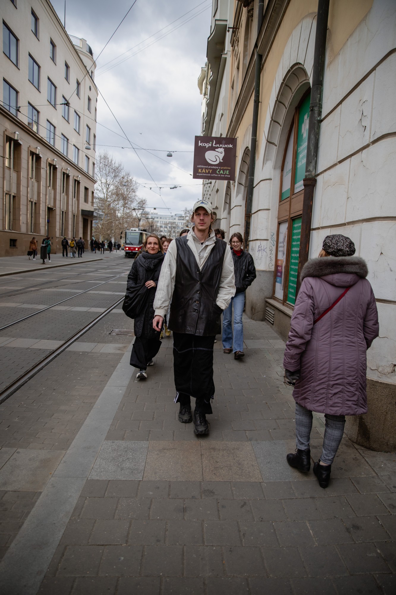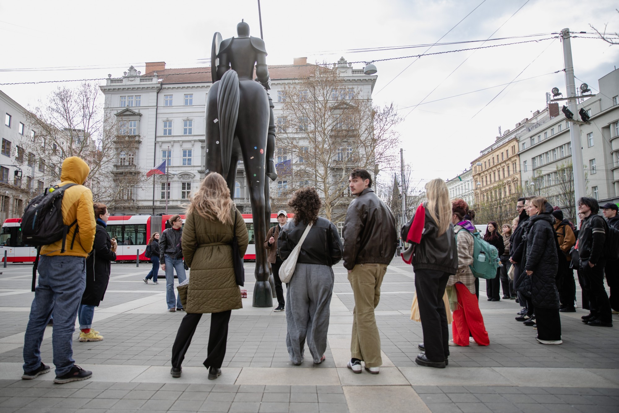 Start na Moravském náměstí u koně, následujte pak muže se žralokem na kšiltovce